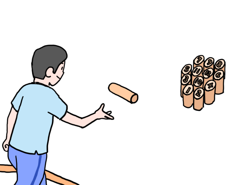 午後1時から地区対抗モルック大会を行います。八幡地域内8地区それぞれ、3人1組のチームで対戦します。