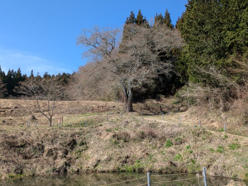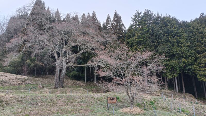 午後3時ごろ、薄曇りの中でたたずむ森湯谷のエドヒガンとクローン桜。