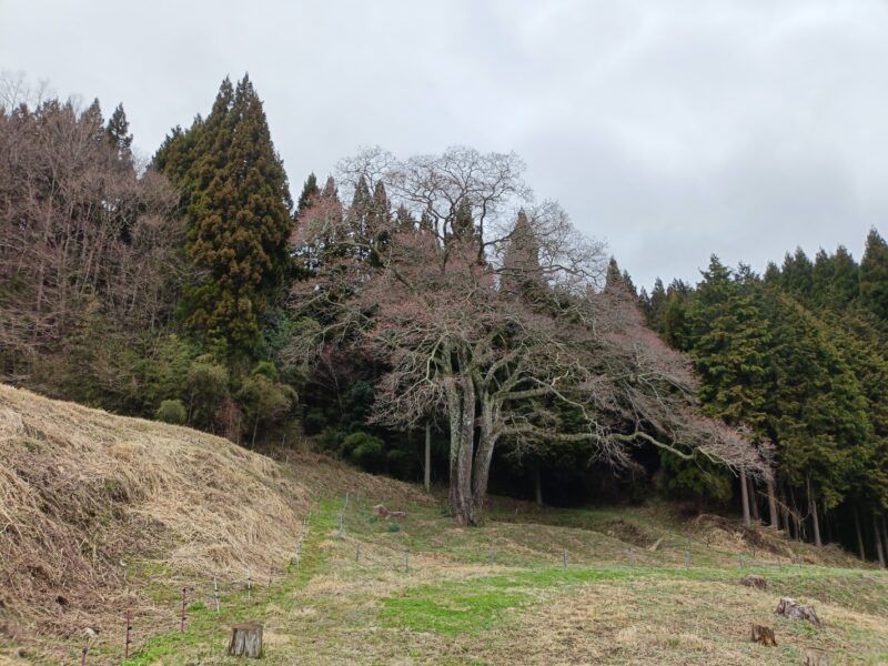 昨夜降った雨あがり。まだ肌寒さが残る森湯谷のエドヒガンのたたずまい。